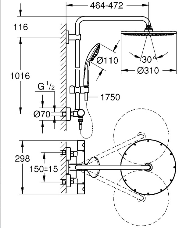 Euphoria 310 Shower System With Thermostat With Euphoria 110 Massage Hand Shower 450mm Shower Arm
